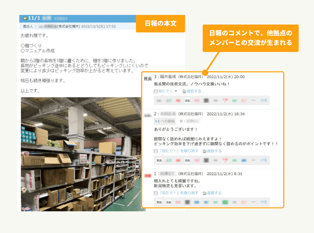 日報を社員全体でも共有- 本社と新潟支店のメンバーが拠点を超えてやりとり。